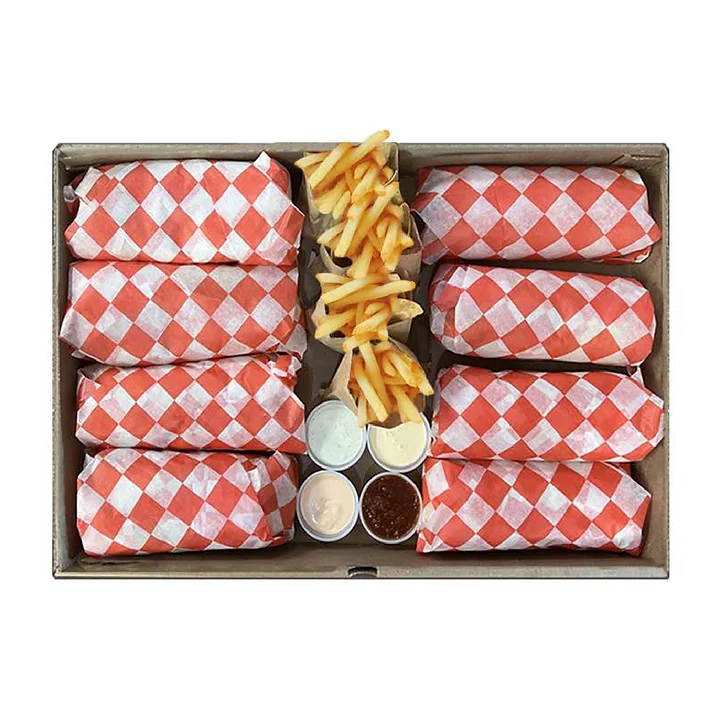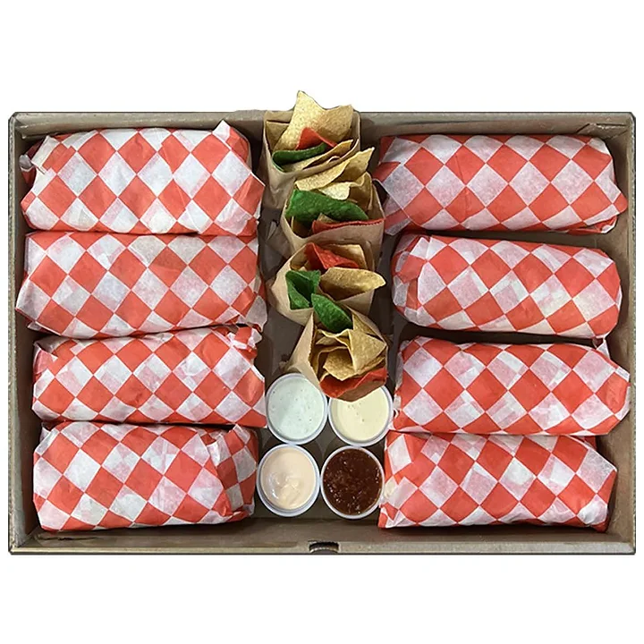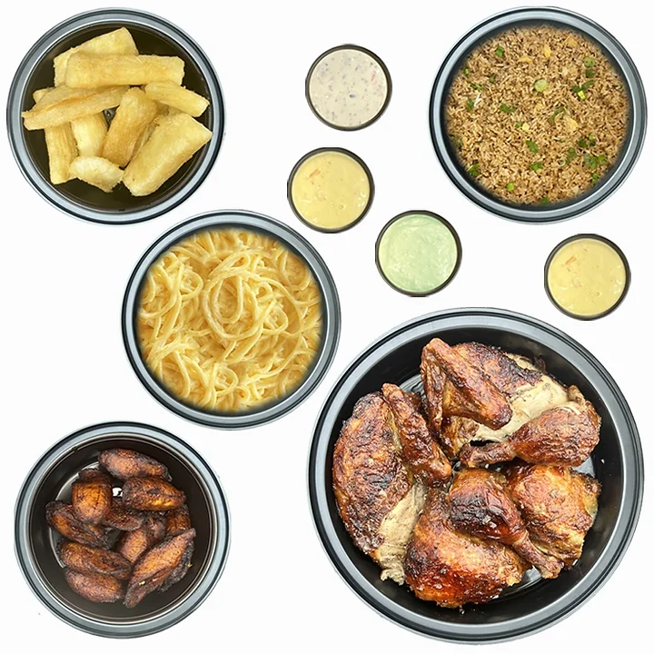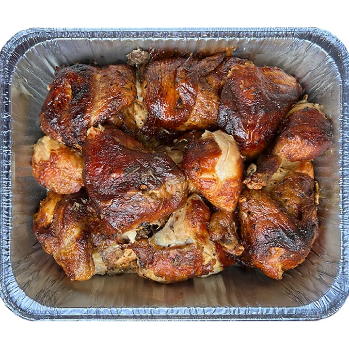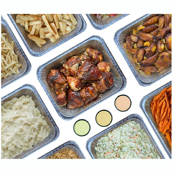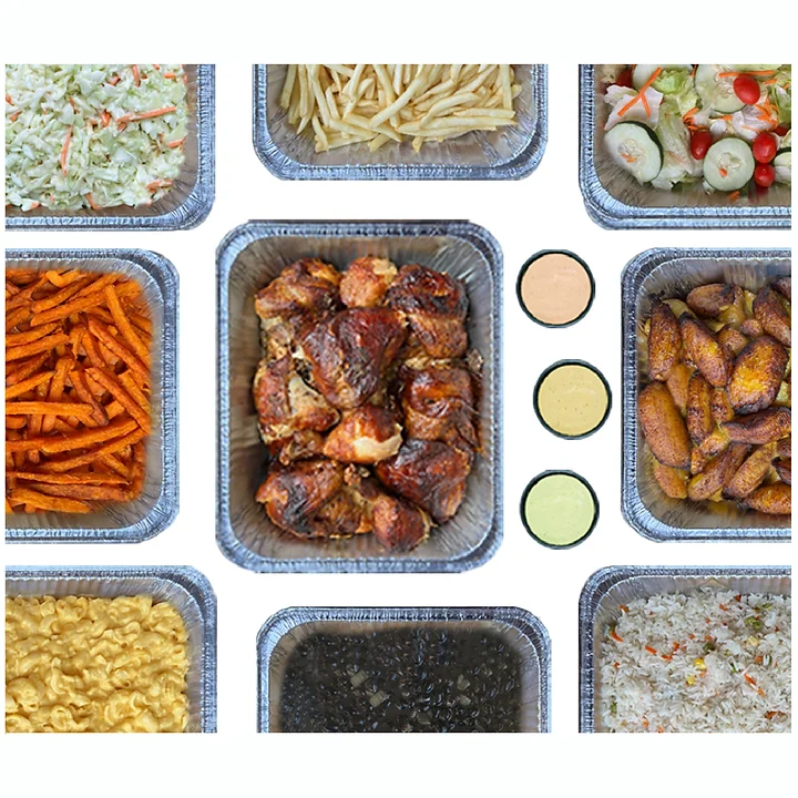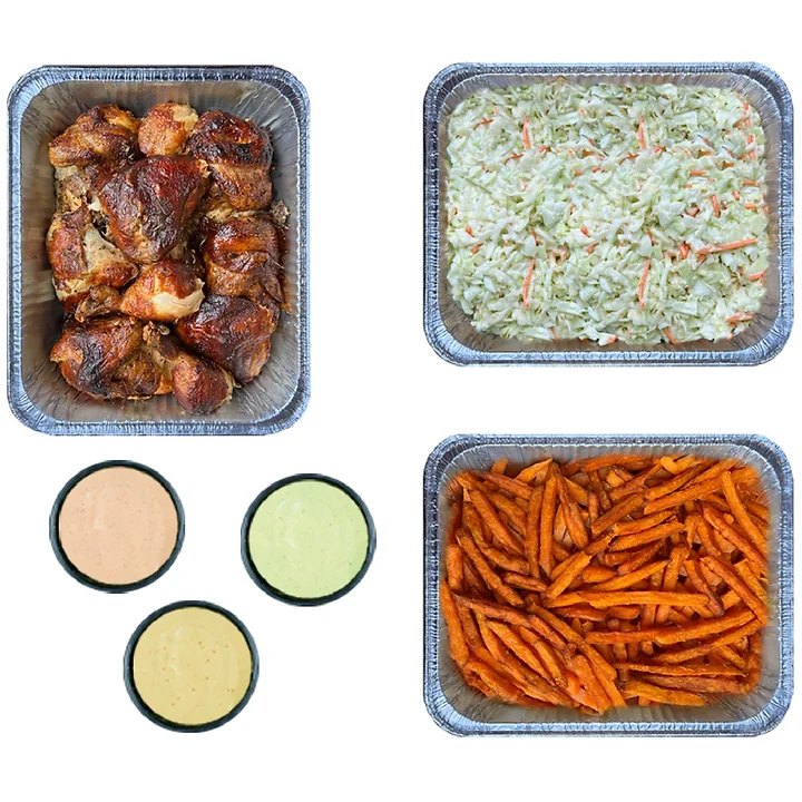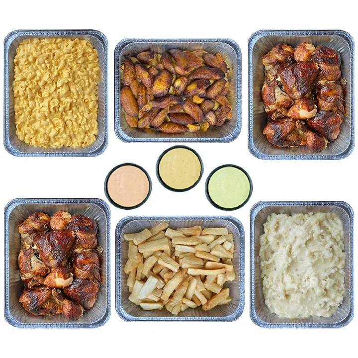 Includes 50 quarter pieces of chicken, your choice of 8 extra- large sides and plenty of our famous dipping sauces.